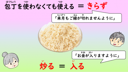 京都では,「来月もご縁が切れませんように」「お金が入ってきますように」と願いを込めて,月末におからを食べる習慣があります。