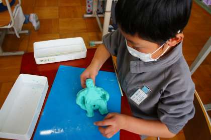 粘土を使って,形にしたい思い出を表します。今日は油粘土を使って練習をしました。よくこねて,ひねって,形を作ってみました。明日,土粘土を使って作ってみましょう!
