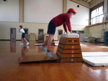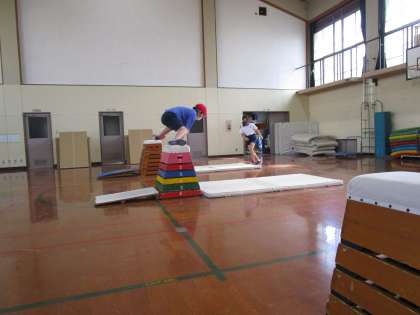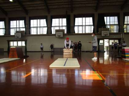 体育科「とび箱運動」では,最初に準備運動や体慣らしのやり方について確かめました。その後,わざ調べをして,自分ができる技,できない技を知ることができました。