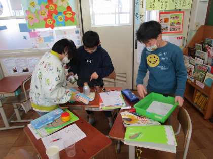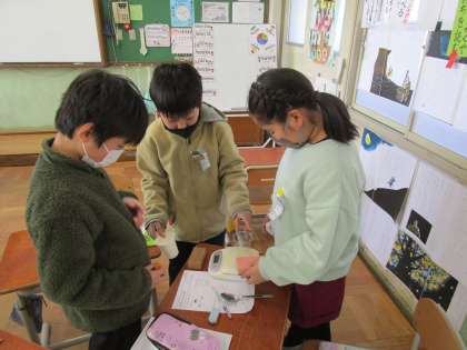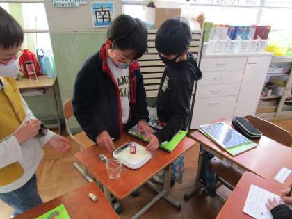 「スポンジは,思ったよりも重いんだね。」「紙コップとプラスチックを比べてみたよ。同じぐらいだと思ったけれど,プラスチックの方が重いんだね。」など,予想したことをもとに話していました。