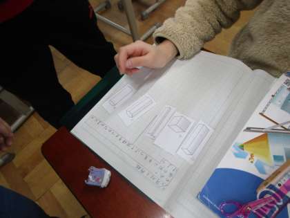 算数科「角柱と円柱」の学習では,5つの立体を2つの仲間に分けていきました。「角がある」「角ばっていない」など,理由をもって2つに仲間分けした子どもたち。その後,「角柱」と「円柱」という言葉を知ることができました。