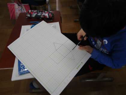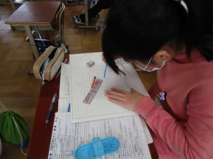算数科「角柱と円柱」の学習では,三角柱の展開図を工作用紙にかきました。その後,はさみで切り取り,組み立てました。展開図を描くコツがつかめたようです。