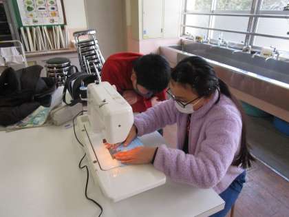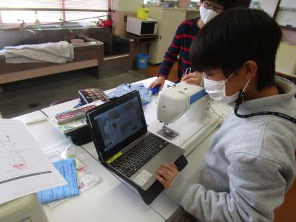 家庭科「ミシンにトライ!」の単元では,前回に引き続き空縫いをしました。方向転換や返し縫いなどのやり方を身につけました。その後,できたグループからタブレットの動画を参考にしながら,上糸や下糸を通す練習をしていきました。