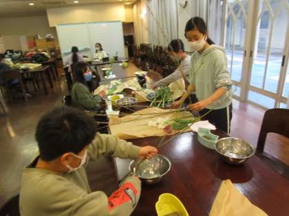 2月21日(月)の16時から生け花体験教室を行いました。草月流の石走先生をお迎えし,切り方や生け方を教わった子どもたち。思い思いの切り方,生け方で作品を作り上げていきました。