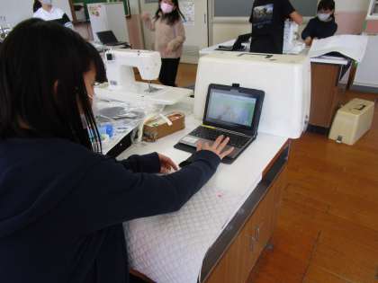 家庭科「ミシンにトライ!」の単元では,ナップザックのわきを縫う活動をしました。布にしるしをつけ,まち針をつけていく子どもたち。動画で細かな点を確認することで,正確に作業を進めていくことができました。