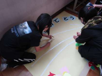 6年生の卒業をお祝いするメッセージボードを作ることになった5年生。一人ひとりが鳥や言葉などのパーツを分担し,心を込めて作っていきました。