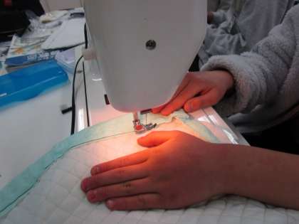 家庭科「ミシンにトライ!」の単元では,ナップザックの取り出し口を縫いました。しつけをしてからミシンで縫い,その後にしつけ糸を外すという手順で,丁寧に縫うことができました。
