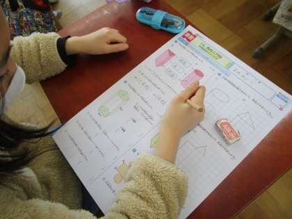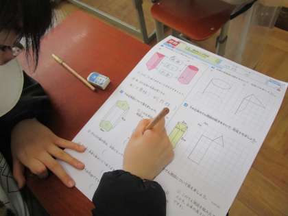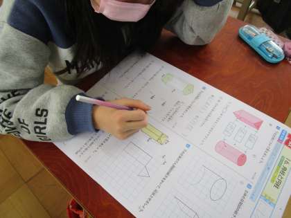 算数科では,「角柱と円柱」のテストに取り組みました。底面の周りの長さが側面の横の長さになることをいかして,長さを答えたり,作図したりすることができました。