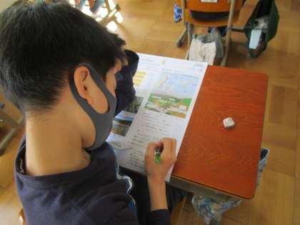 社会科「自然災害を防ぐ」のテストに取り組みました。風水害が起こる前兆を資料からうまく見つけ出すことができていました。