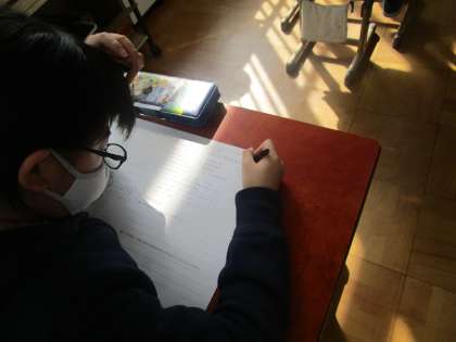 家庭科では「ミシンにトライ!」のテストにトライしました。実習で取り組んだことを思い出しながら,ミシンの部分の名称や使い方などを答えていきました。