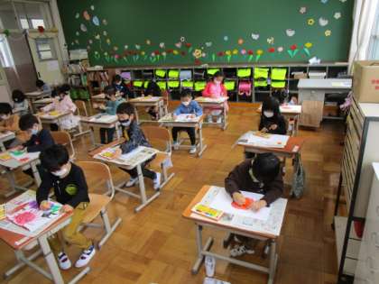「おひさまは,オレンジと赤い色にしようかな。」「虫が好きだから,虫もかきたいな。」など,思いを膨らませながら描いていました。