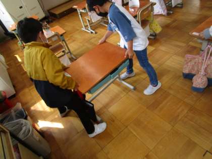 掃除時間に机運びのお手伝いをやってみる1年生。2人で力を合わせて一生懸命に運んでいました。