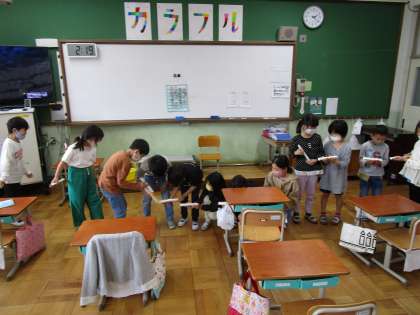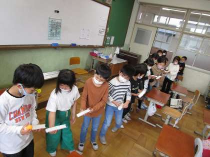 クラスのみんなでも挑戦しました。3度目の挑戦で最後のお友だちまで無事に球が届きました。繋がった瞬間に大きな拍手が起こりました。次は時間で計ってやってみるのも楽しそうですね。