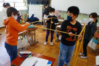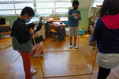 1㎥ってどれくらい?実際に調べてみよう!と,1mのものさしを使って立方体を作ってみました。