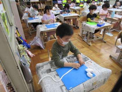 図画工作科「ひもひもねんど」の学習で,ねんどを長く伸ばすことに挑戦しました。