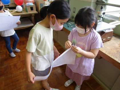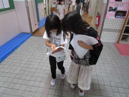 今日は,楽しみにしていた学校探検の日で,1年生とペアになって学校の様々な教室を歩いてまわりました。各教室に貼ってある紹介カードは2年生が作りました。
