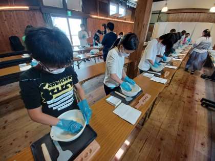 和三盆型抜き体験では、まず、和三盆糖に水を含ませ、よく混ぜます。