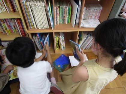 「この本はこの棚に置いたほうが良いかな。」と友だちと相談しながら,本の大きさや種類ごとに分類してくれました。