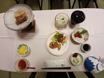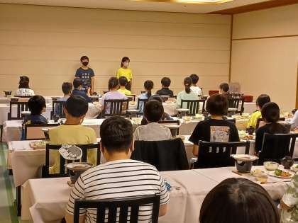 みんなでお願いしますの挨拶をして館内へ、まずは夕食です。一日活動をしてきたので、お腹もペコペコです。地元のタコがふんだんに使われたメニューを堪能しました。