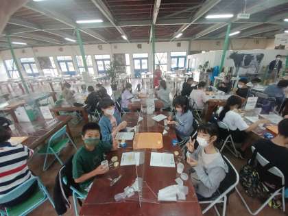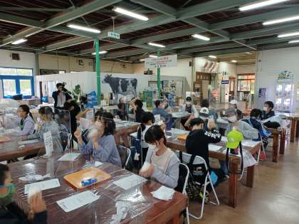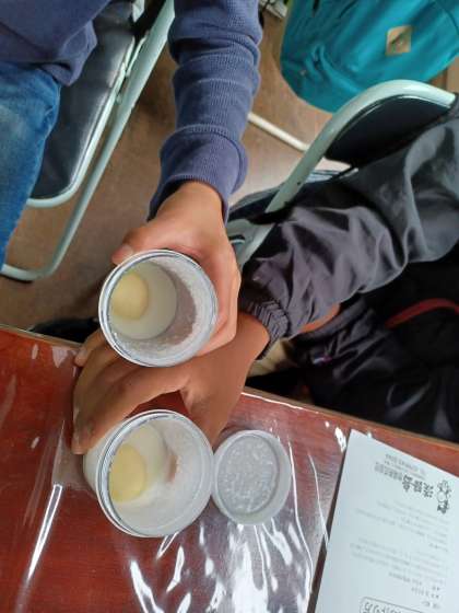 まずは、バター作り体験です。容器に入ったミルクをひたすら振り続けることで、低脂肪牛乳とバターが完成しました。自分で作ったバターの味見もしました。