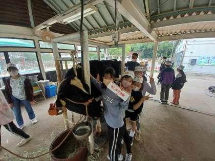 簡単そうに見えてなかなか難しい乳しぼりです。みんなが体験している間、おとなしくしていてくれた牛さんに感謝です。
