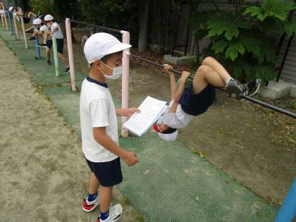 「てつぼうにんにんカード」を見ながら,「この技に挑戦してみよう!」と前向きな姿勢で技の習得に励みました。
