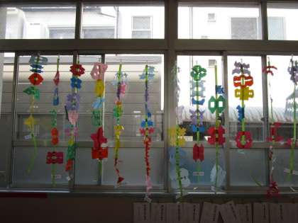 出来上がった作品を廊下に飾りました。風に揺れてとてもきれいです。1年生の廊下が華やいでいます。