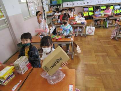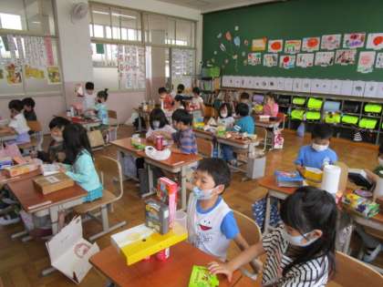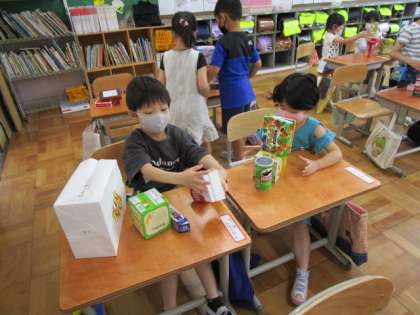 いろいろな形の箱で,動物や乗り物を作りました。友だちとペアになって,つくりたいものを思い浮かべながらつくりました。