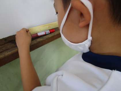 「ホワイトボードは30cmものさしが10個と○cmだったよ!」「○○は予想した長さと同じ長さだったよ!」と長さを測って発見したことをたくさんノートに書きました。