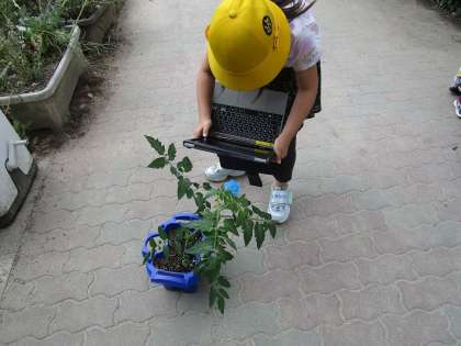 タブレットパソコンをもってミニトマトの撮影へ行きました。