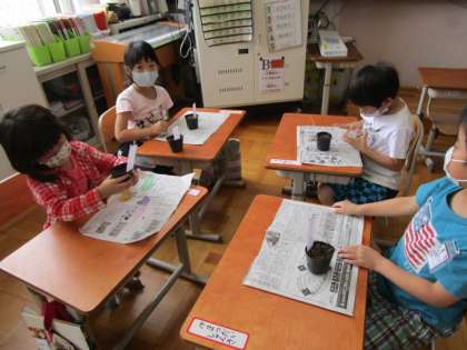 今日は,学年の花壇で育てる花の種まきをしました。ひまわり,マリーゴールド,ほうせんかなどの種を黒いポットにまきました。みんなで育てていきたいですね。