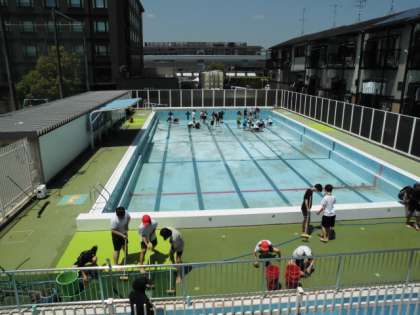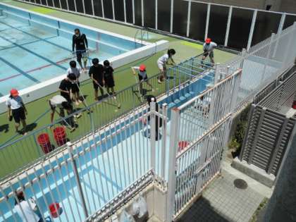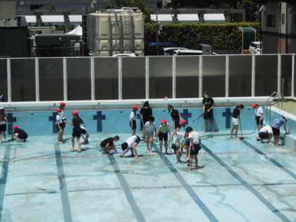 夏を思わせるような暑さになった今日,6年生がプール清掃をしました。