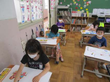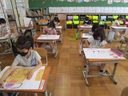 1年生になってからの生活の中で,心に残ったことを絵に表しました。「図書室にはたくさん本があって,いつも楽しいよ。」「体育で,友だちとフラフープをして遊んだのが楽しかったよ。」などと,お話をしながら描きました。