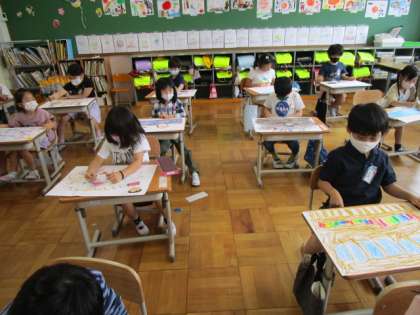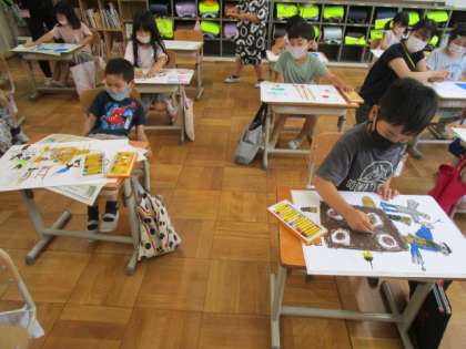 自分や友だち,周りにあるものなど思い浮かべながら丁寧に描いていました。来週,鑑賞会をして,友だちに描いた絵についてお話します。