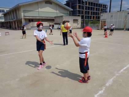 4年生と一緒に体育の陣取りゲームをしました。初めにポートボール台を友達と協力して運び,ボールをパスする練習をしました。友達は,準備の仕方や集合する場所を優しく伝えてくれました。パスの練習で,ボールをうまく受けることができたときには,拍手やほめ言葉が聞こえてきました。優しく一緒に活動するクラスの友達がいることで,安心して学習に参加することができました。