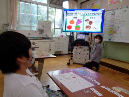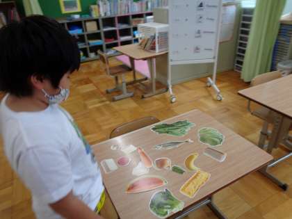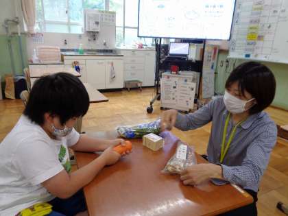 栄養教諭の船田先生に来ていただき,給食についての学習をしました。今日の給食の食材を実際に見たり,触ったり,においだりしました。食材を袋に入れて見えないようにして,何が入っているかをあてるゲームもしました。