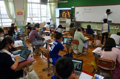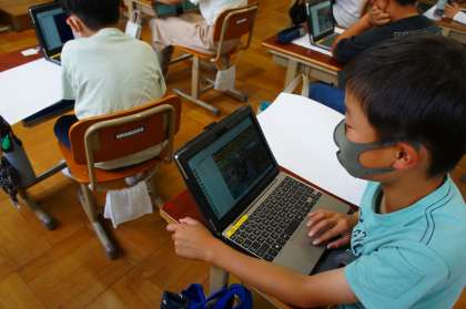 先週に行った,花背山の家での思い出を絵に描き表します。思い思いの場面を決めて,ロイロノートの資料箱から,写真を選んで参考にしたり,参考になりそうな画像を検索したりしていました。