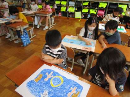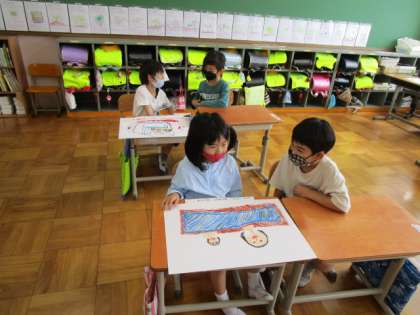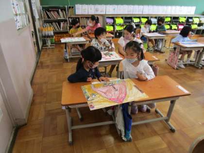 今日は,描いた絵を友だちに見てもらって,お話ししました。友だちのお話を聞いて,友だちの絵のいいなと思ったところを伝えました。1組の鑑賞会の様子です。