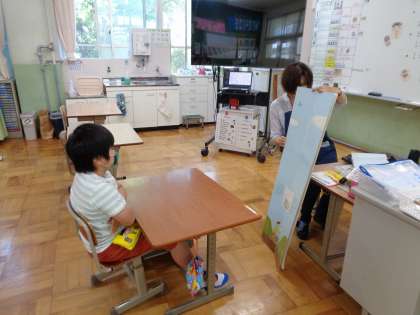 学校司書の一島先生に来ていただき,大型絵本「100かいだてのいえ」の読み聞かせをしてもらいました。大きな絵本をじっと見ていました。先生が「次の階には誰が住んでいるでしょう?」と聞かれると,絵本の絵を見て「へび。」と答えていました。