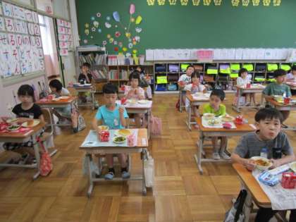 今日は初めての水遊びでした。水遊びでしっかり体を動かした後の給食の時間です。おかわりもしっかりして,たくさん食べました。