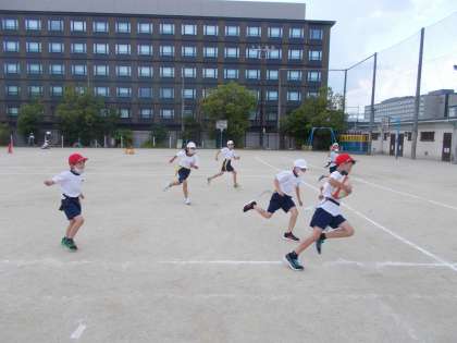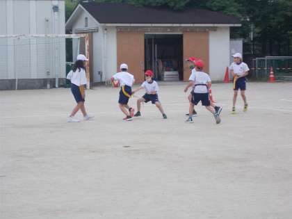 体育の学習で陣取りゲームをしています。今日は,単元の4時間目で対抗戦(同じチームと2試合)をしました。攻める方も,守る方も一生懸命です。チームで力を合わせて頑張っています。