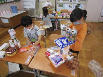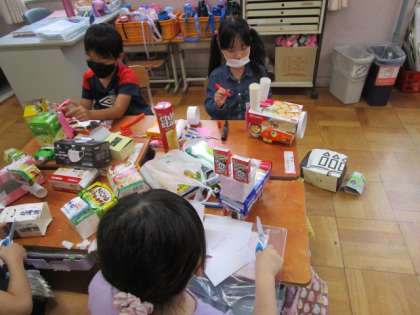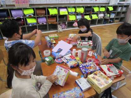「口が開くようにしたよ。」「トイレットペーパーの芯は,タイヤにできるね。」など,思いを膨らませながらつくりました。