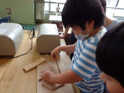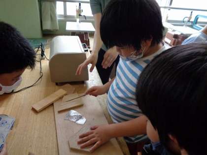 クラブのみんなに見守られながら,熱くなったプラ板を板で押さえて,ドキドキしながら板を外すと・・・うまくできていました。とっても満足そうでした。