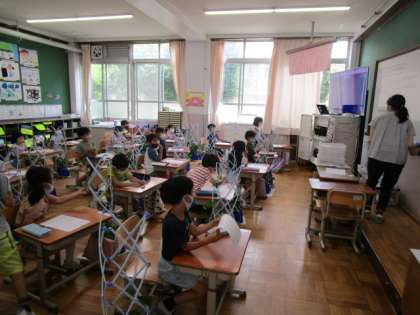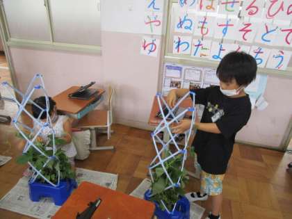 先日の生活科の時間に,「つるが伸びてきて,友だちのほうにいっているので,ぼうを立てたいです。」と話したお友達がいました。そこで,今日支柱を立てることになりました。週末の間にさらにつるが伸び,友だちのつると絡み合っていました。