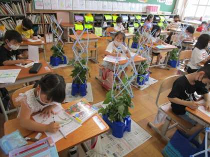 支柱を立てた後,観察カードを書きました。ひらがなをたくさん学習し,文章に表すことがだんだん上手になってきました。前の時と比べて,大きくなった様子を記す姿が見られました。