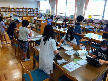 知りたい工夫について調べるために,タブレットや学校図書館の図書などを使っています。どこから調べたのか,出典を明らかにすることが大切ですね。