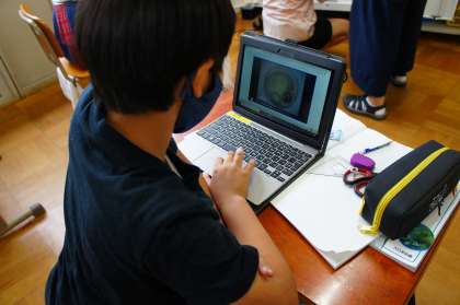 実際に観察しているメダカについて,卵の中でどのように成長して,子メダカになるのか調べました。タブレットを使って動画を視聴し,成長の順になるように図を並び替えました。また,それぞれの写真について,気が付いたことをノートに書きました。