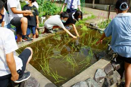 畑に加えて、田んぼも始めることになりました。校長先生に教えてもらいながら、一つ一つ苗を植えます。