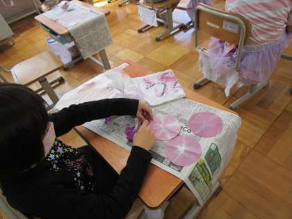 こすりだしの遊びでは、花の下の部分をはさみで切取り、花を広げて半紙にはさんだ後、クリアファイルにはさみ、上からこすりました。きれいな模様が出てきました。