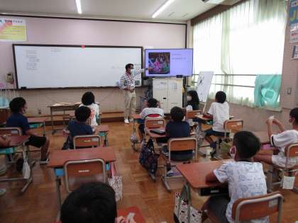 先生の自己紹介では、母国の有名な観光地や食べ物、気候、好きな食べ物やスポーツ、趣味などを日本語も交えながら楽しくお話ししてくださいました。子どもたちも、先生の英語と日本語での自己紹介を一生懸命聞いていました。